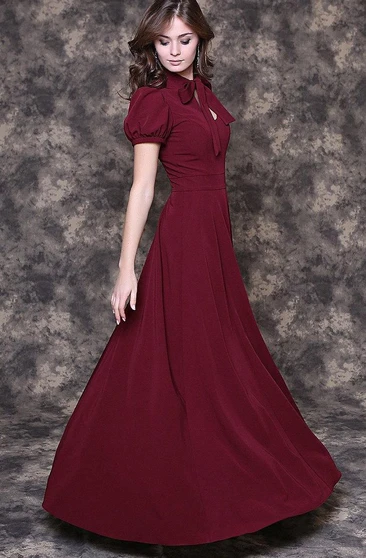 Short sleeve long bridesmaid dress with applique.
